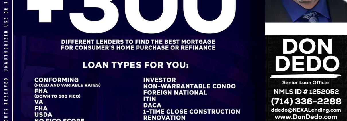 Hi, my name is Don Dedo. I’m a Loan Officer with NEXA Lending LLC., offering personalized mortgage solutions, fast customized quotes, great rates and service with integrity.