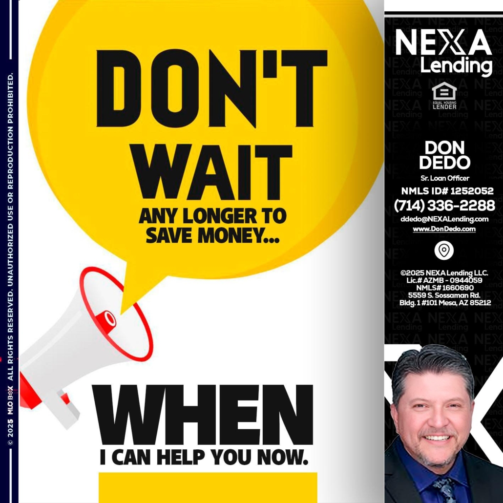 DONT WAIT - Don Dedo -Mortgage Loan OriginatorHi, my name is Don Dedo. I’m a Loan Officer with NEXA Mortgage LLC., offering personalized mortgage solutions, fast customized quotes, great rates and service with integrity.