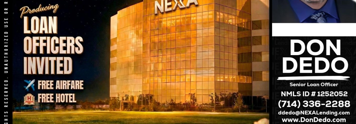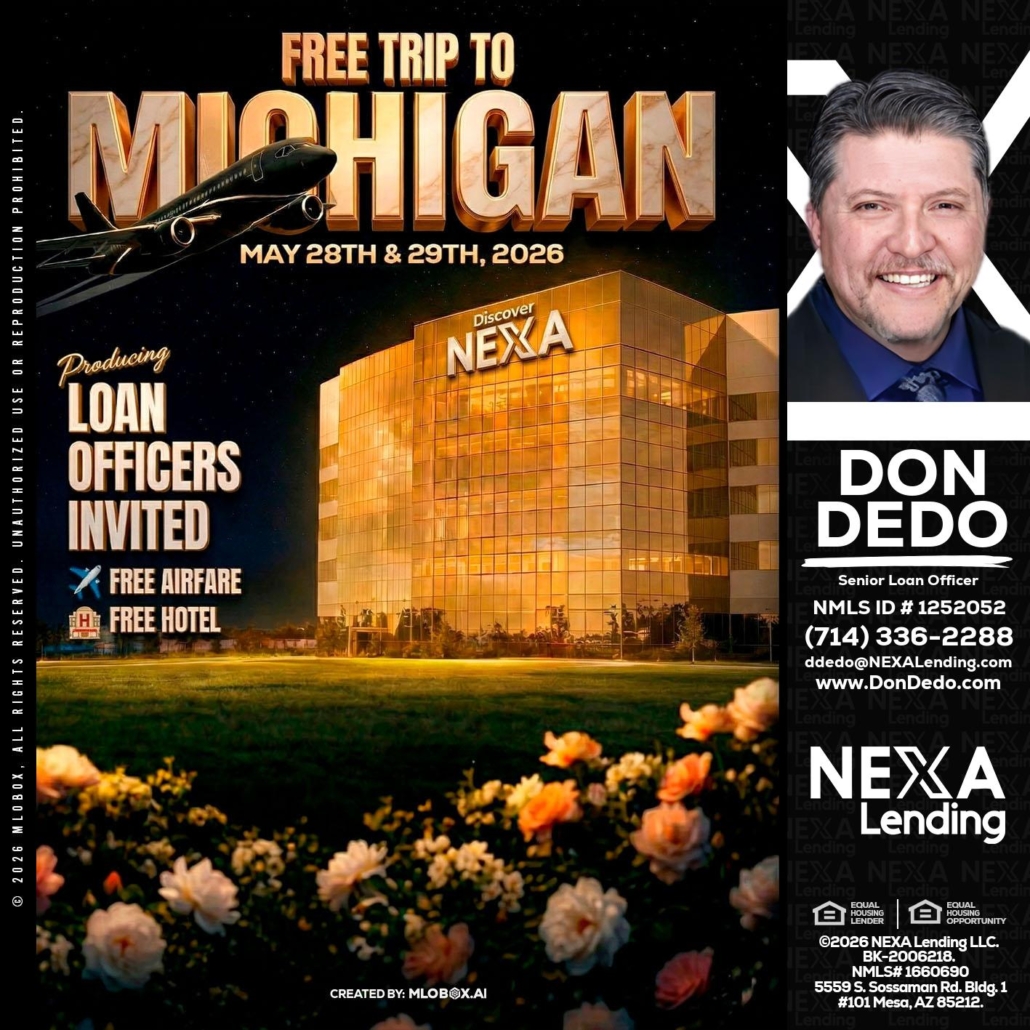 FREE TRIP TO MICHIGAN - Don Dedo -Mortgage Loan OriginatorHi, my name is Don Dedo. I’m a Loan Officer with NEXA Lending LLC., offering personalized mortgage solutions, fast customized quotes, great rates and service with integrity.