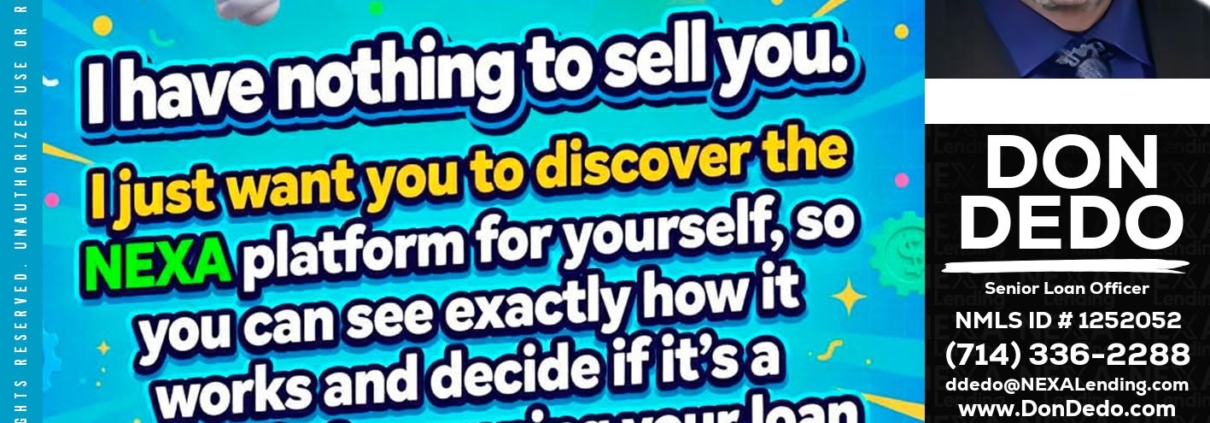 Hi, my name is Don Dedo. I’m a Loan Officer with NEXA Lending LLC., offering personalized mortgage solutions, fast customized quotes, great rates and service with integrity.