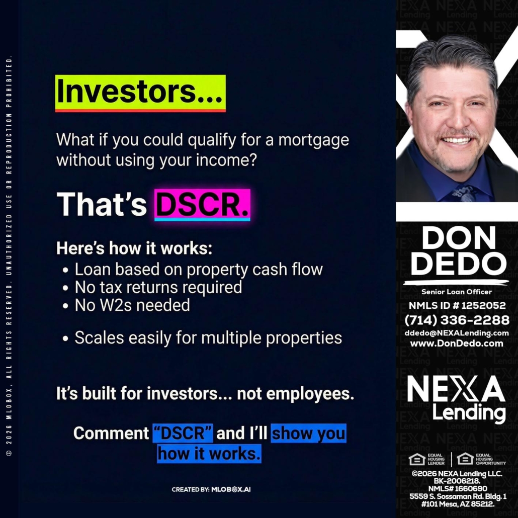 Hi, my name is Don Dedo. I’m a Loan Officer with NEXA Lending LLC., offering personalized mortgage solutions, fast customized quotes, great rates and service with integrity.