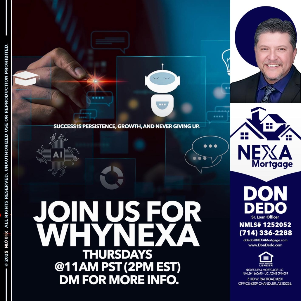 JOIN US FOR WHY NEXA - Don Dedo -Mortgage Loan OriginatorHi, my name is Don Dedo. I’m a Loan Officer with NEXA Mortgage LLC., offering personalized mortgage solutions, fast customized quotes, great rates and service with integrity.