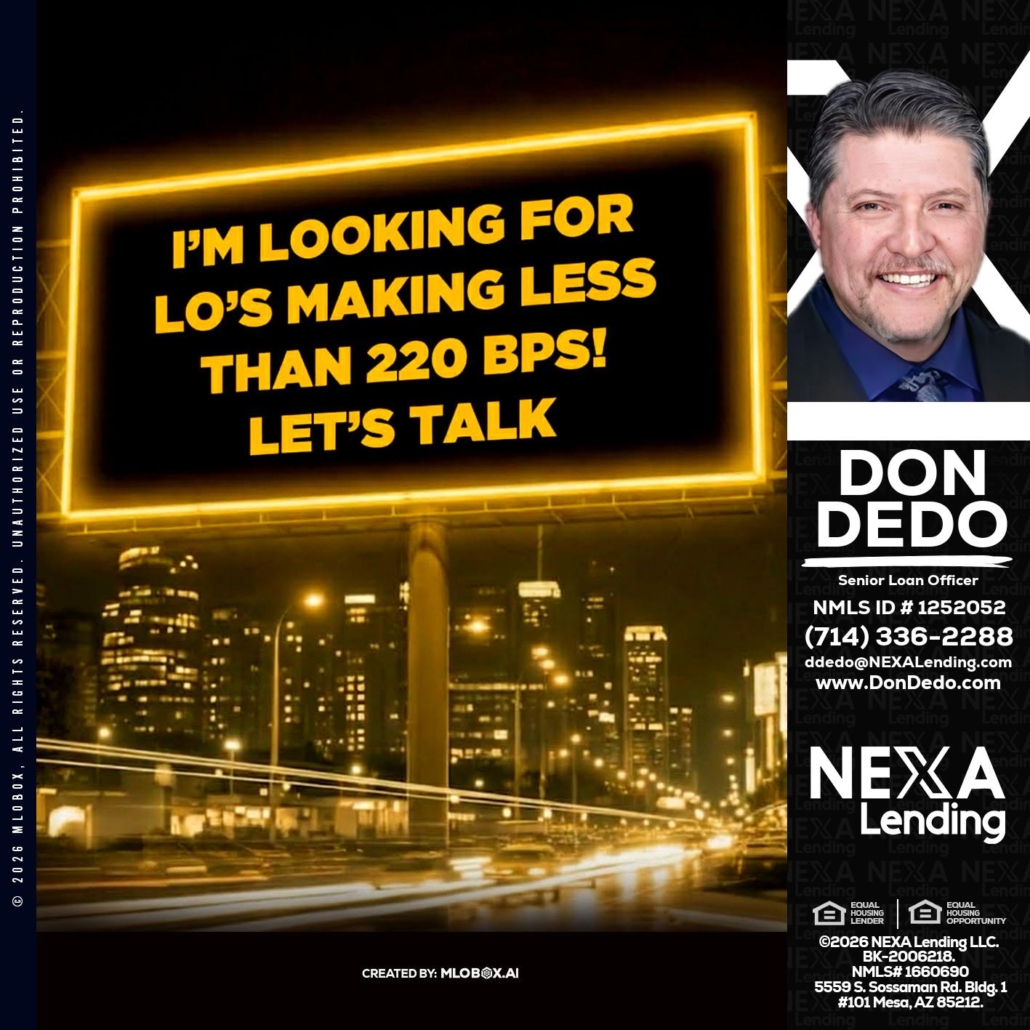 Hi, my name is Don Dedo. I’m a Loan Officer with NEXA Lending LLC., offering personalized mortgage solutions, fast customized quotes, great rates and service with integrity.
