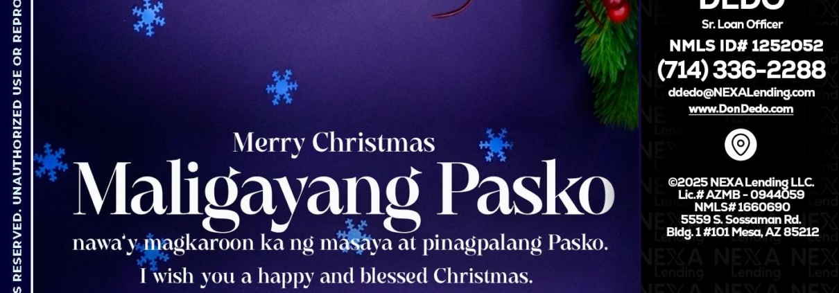 Maligayang Pasko - Don Dedo -Mortgage Loan OriginatorHi, my name is Don Dedo. I’m a Loan Officer with NEXA Lending LLC., offering personalized mortgage solutions, fast customized quotes, great rates and service with integrity.