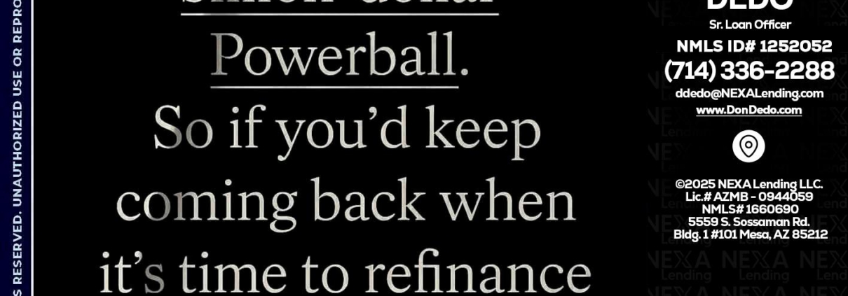 Hi, my name is Don Dedo. I’m a Loan Officer with NEXA Lending LLC., offering personalized mortgage solutions, fast customized quotes, great rates and service with integrity.