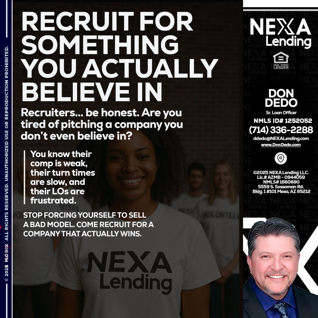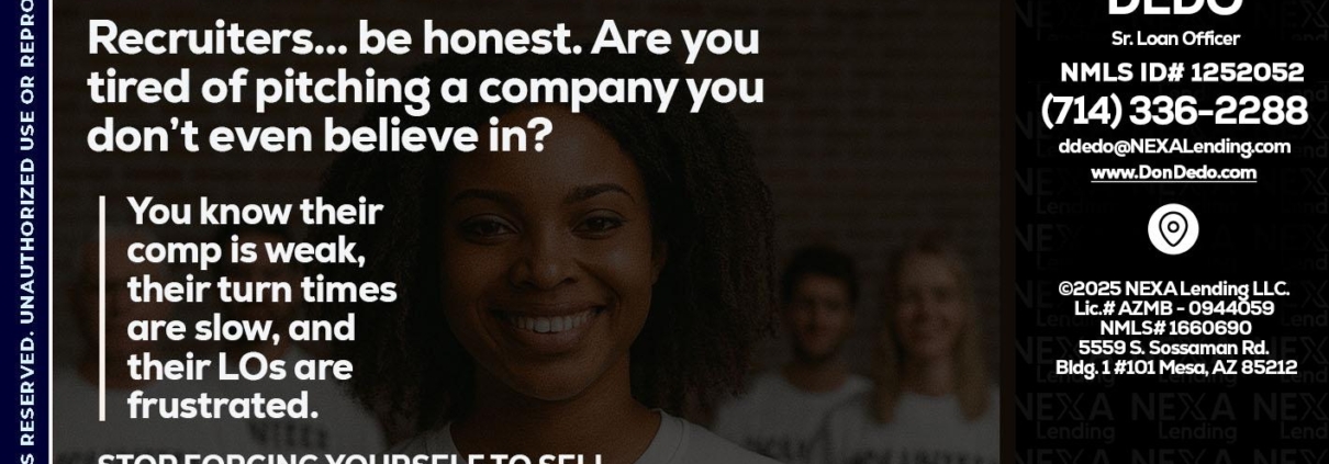 Hi, my name is Don Dedo. I’m a Loan Officer with NEXA Mortgage LLC., offering personalized mortgage solutions, fast customized quotes, great rates and service with integrity.