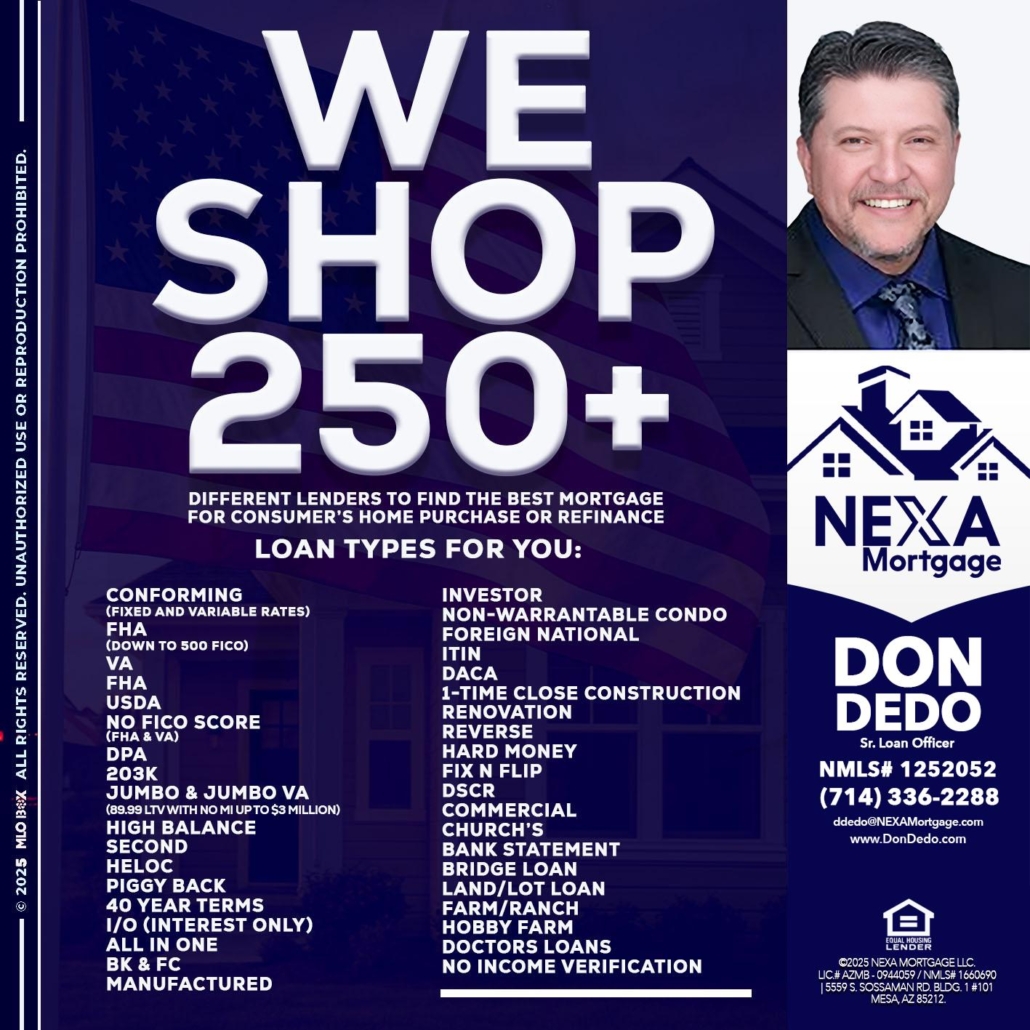 Hi, my name is Don Dedo. I’m a Loan Officer with NEXA Mortgage LLC., offering personalized mortgage solutions, fast customized quotes, great rates and service with integrity.