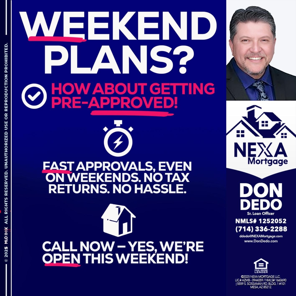 Hi, my name is Don Dedo. I’m a Loan Officer with NEXA Mortgage LLC., offering personalized mortgage solutions, fast customized quotes, great rates and service with integrity.